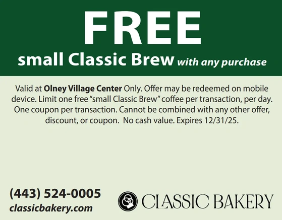 Valid at Olney Village Center Only. Offer may be redeemed on mobile device. Limit one free “small Classic Brew” coffee per transaction, per day. One coupon per transaction. Cannot be combined with any other offer, discount, or coupon. No cash value. Expires 12/31/25.