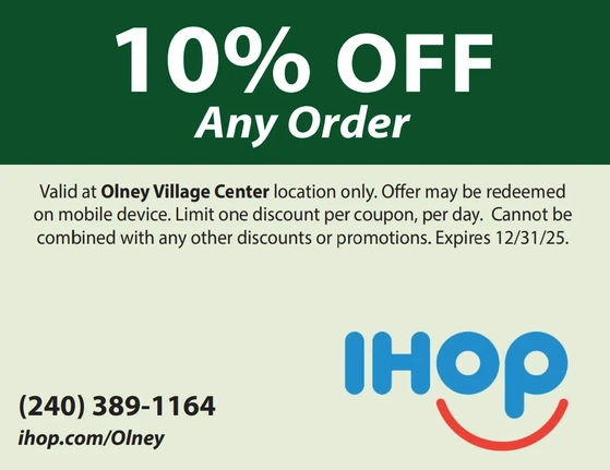 Valid at Olney Village Center location only. Offer may be redeemed on mobile device. Limit one discount per coupon, per day. Cannot be combined with any other discounts or promotions. Expires 12/31/25.