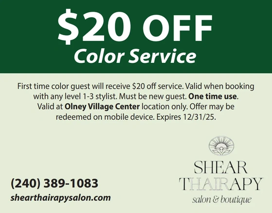 First time color guest will receive $20 off service. Valid when booking with any level 1-3 stylist. Must be new guest. One time use. Valid at Olney Village Center location only. Offer may be redeemed on mobile device. Expires 12/31/25.